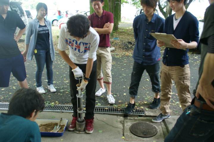 平成25年6月20日(木) 後半グループ第3回学生実験が行われました。 今回は締固め試験を行いました。重いランマーに苦労する女の子、 締固まった供試体を一生懸命壊す男の子。一番体力を要する実験でしたが、 どのグループも無事に実験を成功させていました。 湿度の高い中難しい実験でしたが、 皆さんお疲れ様でした。