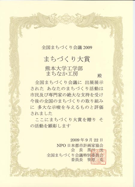 全国の都市計画の専門家から構成されるNPO日本都市計画家協会(黒川洸会長)は,全国のまちづくりの取組みの中から,優れた理念を持つ活動や計画, プロジェクトを日本都市計画家協会賞として表彰しています.今回,工学部まちなか工房の5年間にわたる取組み「まちづくりの家庭医を目指して -熊本大学工学部まちなか工房による中心市街地のまちづくり支援-」が評価され,28件の候補の中から,第7回日本都市計画家協会賞の最高賞である 「日本まちづくり大賞」を受賞しました.選考理由の理由は以下です.