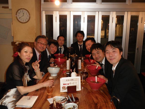 婚期も報告もちょっと遅くなりましたが,計画研2期生の盛坪美佳さん(福岡県庁勤務で,確か3?歳のはずですが)が,同僚で年下の坂口さんと結婚されました. 1期生の松山君,同期生の椛島君,亀山君,河内君,柴木君,首藤君,竹林君と溝上教授が結婚披露宴に参加し,盛坪さんからの達ての依頼に応じて, 今回もあの古式に則った伝統の全身白タイツ軍団によるお祝い芸が披露されました.この珍芸,いつまで続くのやら. 久しぶりにバブリーな披露宴の後,3次会には新婚を呼び出して博多名物博多一風堂ラーメンを味わいました. 溝上教授もこれで少しだけ気掛かりだったことが解決したようで,ほっと一安心です.お幸せに.