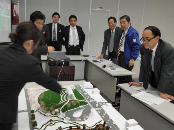 社長をはじめとした熊電の幹部を前に,平成21年度の3年生科目「社会基盤設計演習」で取り組んだ6人の3年生が「熊電駅公園化計画」を提案しました. この計画は,熊電沿線を丸ごと公園化するという壮大なもので,個々の駅をその駅の環境や役割にあった季節の公園にしようというもので,今回は御代志駅を, 再春館病院の患者さんや電波高専の学生が待ち望んでいる春の公園として整備しようというものです.