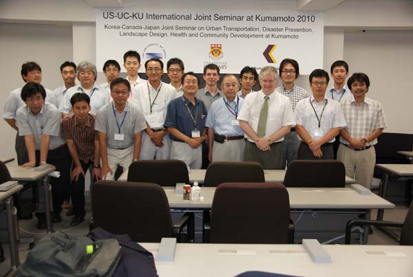猛暑の8/25~5/27の3日間にわたって,熊本大学工学部社会環境工学科持続可能な地域づくり研究グループ(代表: 溝上章志教授)が主催した 「熊本大学・ソウル大学・カルガリー大学共同セミナー 2010」-交通・防災・景観・健康・まちづくりに関する3大学合同国際会議-が開催されました. 自然科学研究科では,本学科のまちづくりと地域防災研究グループを中心として,2009年2月にソウル大学と交流協定を締結し,学術・学生の交流, 共同研究を進めています.2009年2月には,ソウル大学と熊本大学による2大学の合同セミナーが熊本で開催され, 同年9月にはソウル大学がカルガリー大学と共同で開催していた研究発表会に熊本大学も参加し,第1回目の3大学共同セミナーがソウルで開催されました. その継続として,今回は熊本大学で主催したものです.ソウル大学からは5名,カルガリー大学からもJohn Douglas Hunt (Professor) とAlex de Barros (Assistant Professor) の2人が遠くカナダから参加してくれました.表題の通り,会議の対象は幅広く,国内の都市・交通計画系や公衆衛生関係の若手研究者からも多数,研究発表がなされ, 熱い議論と交流が展開されました. プログラムは別紙に示しています.また,写真はWelcome Partyの様子,研究室の溝上教授と丸山准教授,是非発表させて欲しいと申し込みのあった両角工学部長の発表風景, 記念集合写真です.みんな楽しそうですね.次回はカナダカルガリー大学での開催が約束されました.