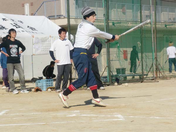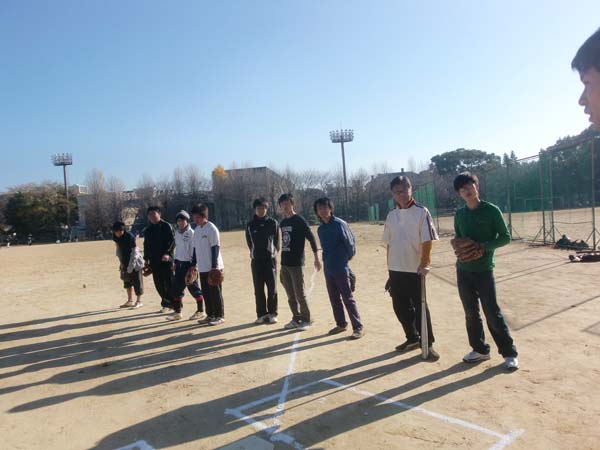 12月5日(土)に恒例の社会環境工学科秋のソフトボール大会が開催されました.例年より2週間遅い開催でしたが,晴天と暖かさに恵まれ, 混成チームも含めて14研究室,および各学年から選抜チーム3の合計17チームが参戦しました. 教員が自らレギュラー参戦したのは,構造研の葛西准教授と小池研の麻植助教,それに我が溝上研の溝上教授だけでした. 例年のように,最も楽と思われているピッチャーを担当し,予選第2試合では大津・重石研チームを相手に,おそらくは唯一と思われる完封試合を成し遂げました. 1勝1敗得失点差により,2位でC組予選を突破し,準々決勝でA組1位の2年生の選抜チームと当たりました.2年選抜チ-ムは全員野球経験者で, 若い上にスイングの早さが違う!女性参加によるボーナス点2を加えても,3対10で完敗,惜しまれつつ準々決勝で散りました.