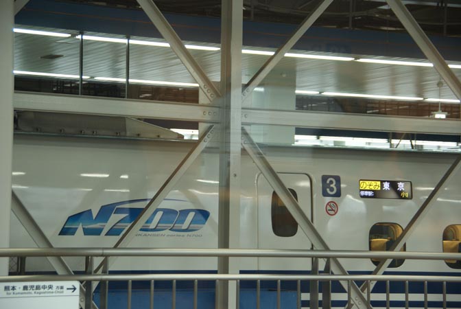 15時42分発のさくら仕様試運転車1号はゆっくりと熊本駅12番ホームを滑り出し,途中,新玉名,新大牟田, 筑後船小屋,久留米,新鳥栖に停車して,おおよそ50分かけて博多駅に到着しました.向 かいのホームには東京行きのN700系のぞみが停車しており,一本の新幹線レールで確実に東京まで繋がっていることを実感しました. 各駅停車ですので最高速度(220km/h?)までは出しておらず,景色が後ろへ飛び去る,あの少し怖いスピード感は味わえませんでした.