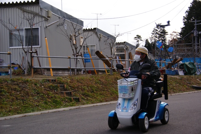 熊本県とホンダ,それにモンパルQoL評価グループメンバーとで東松島市のひびき工業団地内の仮設住宅を訪問しました. ここでは,10月から仮設の住宅と店舗の間の移動にPMのホンダモンパル3台を共同利用してもらっており,今回の訪問は利用者へのグループインタビューと健康測定が目的でした. 一つの仮設住宅地とはいっても,工業団地内の端から端まで1キロ程度離れているため,管理してもらっている集会場まではかなり遠いこと, 利用しそうな高齢の被災者はかなりいると思われるが,その方々への広報が十分にされていない,買い物は車で離れたスーパーに行く, 幹線道路は交通量が多く歩道が狭いので危険であるなどの理由で,数人のヘビーユーザーを除いてあまり活用されていないことも分かりました. 帰りに海岸近くの津波による被災地を訪問し,かつては温かな家庭であったろう家々の悲惨な風景を目の当たりにして絶句してしまいました.