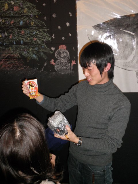 街中のイルミネーションを見ると「熊本は節電する気あるのかなー?」と思う今日この頃ですが,皆さんいかがお過ごしでしょうか. そんな中,毎年恒例の溝上研・円山研合同クリスマス会を行いました.おいしく鍋を頂いた後,プレゼント交換を行いました. みなさん,何故かそれぞれの性格に合ったプレセントが回ってきたようでとても嬉しそうにしていました. しかし,研究室一潜在能力シャルが高いかもしれないのに研究室一卒業が危ぶまれている相川君がプレゼントを家に忘れてくるという失態をやってのけました. 写真のように,プレゼントを忘れて必死に頭を下げていた相川君が,卒業間際に溝上先生に必死に頭を下げることの無いよう,みんなでバックアップしていきたいと思います.
