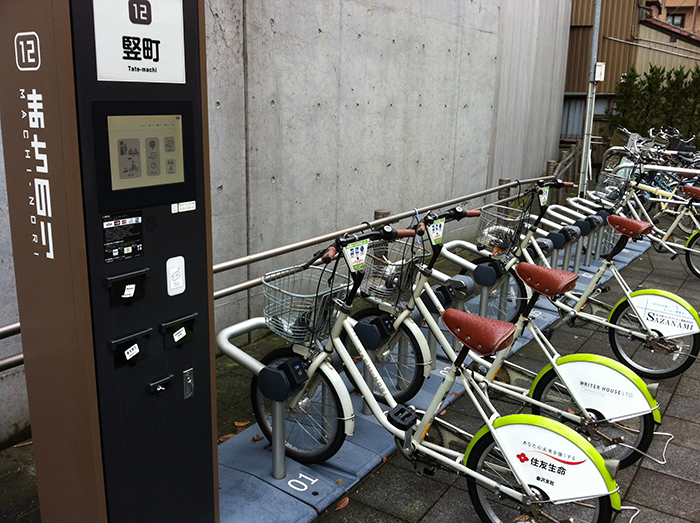 朝の竪町商店街とそこにあったまちのり(ワンウェイ型レンタサイクル)です.文化や食だけでなく,このような先進的な交通システムも熊本より一歩進んでいるような気がします.