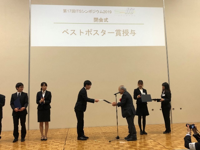 12月12,13日に金沢市の石川県地場産業振興センターで開催された第17回ITSシンポジウム2019「未来社会に向けたこれからのまちづくり・地域づくり」において,「3-A. MaaS・公共交通・シェアリング」のセッションの並み居る14編の発表の中から,ベストポスター賞を受賞しました. 発表のタイトルは「完全自動運転シェアカーサービスが自動車の移動と駐車に与える影響分析」です.ポスターの前半は今のM1の八重君の卒論の結果ですが,後半部分の駐車パターンの分類と必要駐車スペース数は古賀君がPT調査のマスターデータを分析したり,シミュレーションで算出したりした結果です.