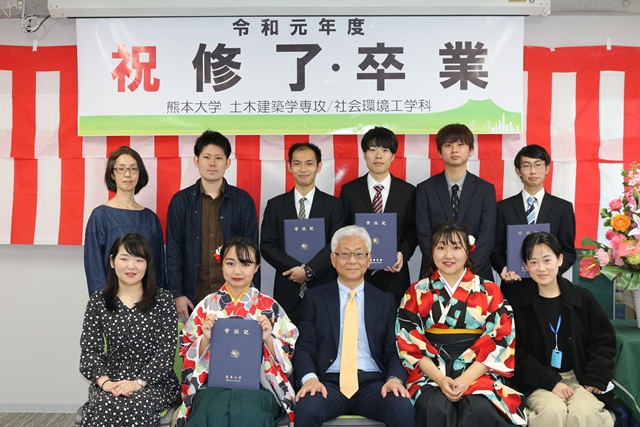 感染症や自然災害は人類が繰り返し直面し,その度に克服してきたものです.今後は各自,新たな環境の下で仕事や勉学に励まれることになりますが,皆さんには熊本大学大学院自然科学教育部土木建築学専攻,熊本大学工学部社会環境工学科,さらに加えて交通まちづくり研究室の修了生,卒業生としての自信と誇りを持ち,培った教養の下で心身とも豊かな人生を送ると同時に,学んだ専門知識を社会に還元して,今後も直面するかもしれない更なる困難やリスクに立ち向かい,解決していってくれることを祈念します.