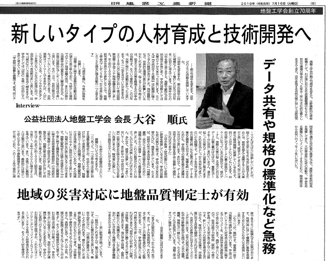 また、6月より公益社団法人地盤工学会会長を務める大谷教授が、平成30年7月豪雨について学会の対応を紹介した記事が建設工業新聞に掲載されました。