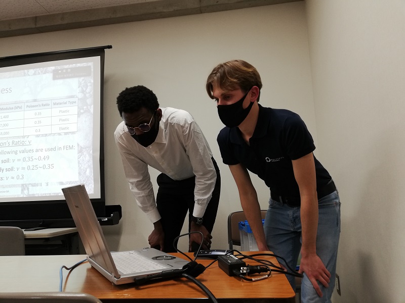 次にグルノーブル大学の先生もオンラインで参加し、演習課題として取り組んだ斜面安定解析について発表しました。2人の頑張りに研究室のメンバーもかなり刺激を受けました。